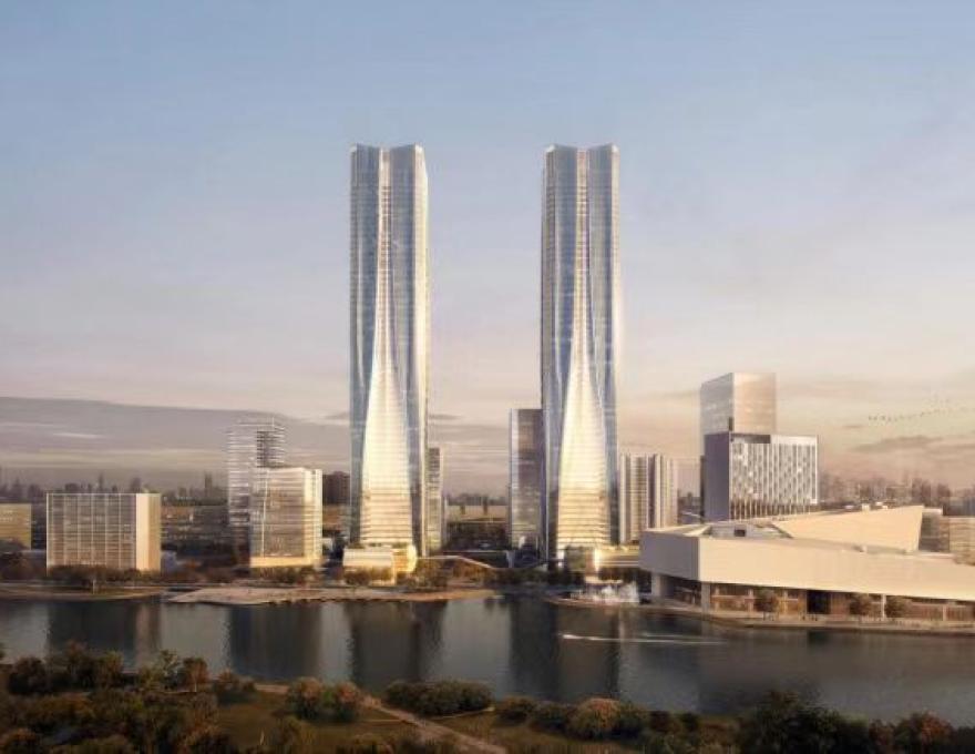 张江科学之门AI加速器位于张江科学之门东塔低区,总建筑面积约32万平米,包含一幢59层、320米高办公塔楼,一幢25层、100米高酒店塔楼,以及1幢4层的商业裙楼、3层文化中心,整体4层地下室,是兼具办公、酒店、商业、文化等多种高端业态于一体的超大型综合体项目。